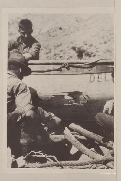 The hole punched in the "Dellenbaugh" while lining Rapid #5 near the head of Cataract Canyon, Mile 210. Calloway above