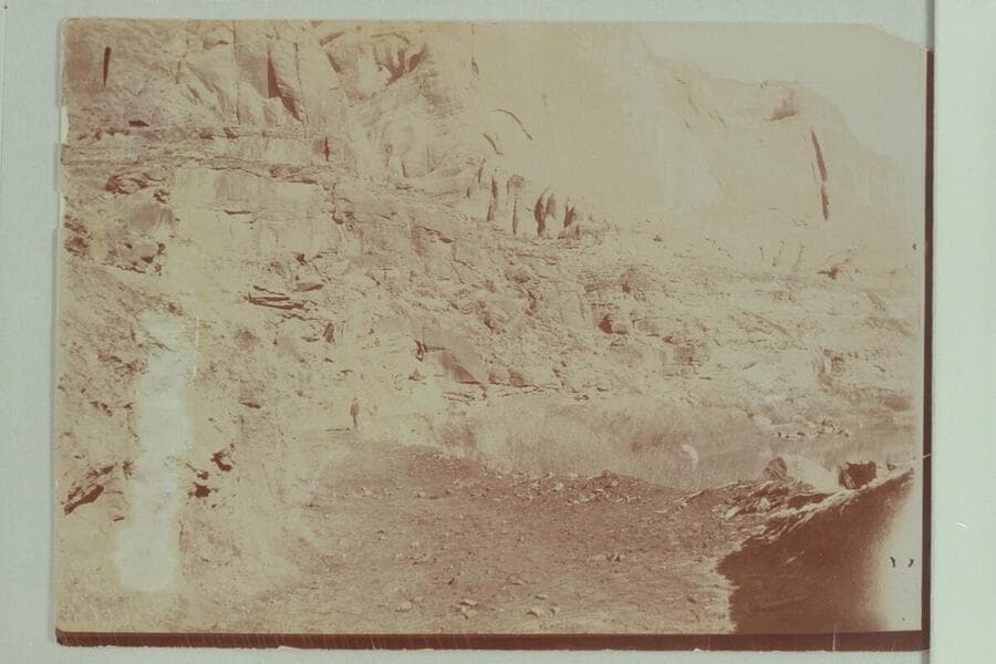 Roadway between Hole in the Rock and the San Juan River. Right bank; Glen Canyon. Nathaniel Galloway is the figure at the right