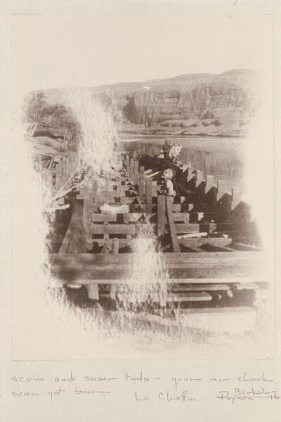 The scow under construction. The scow was used during the building of the dredge. It was pulled by lines from the lower to the upper bar to carry the freight