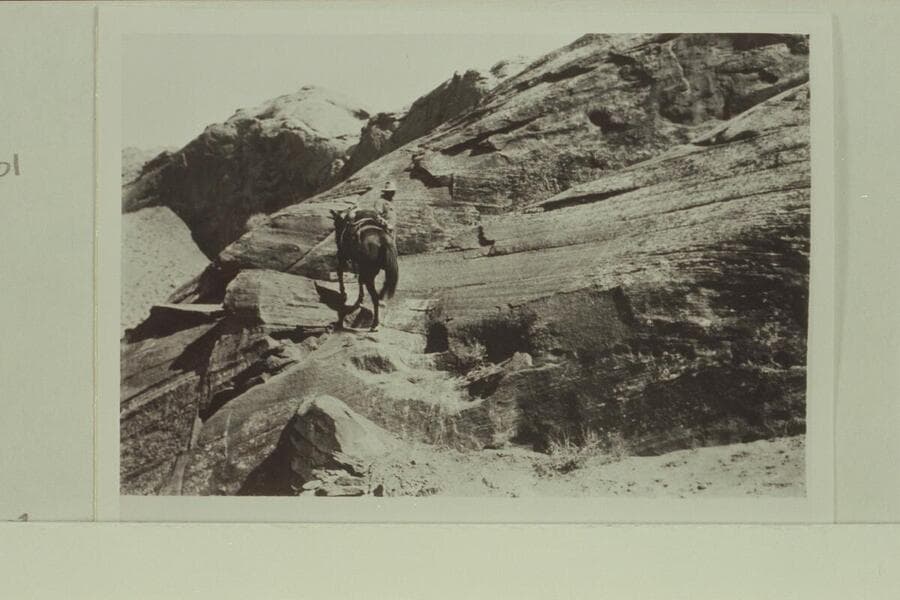 Blacks Trail and steps out of the canyon of the Escalante River. Jess Barker is leading a horse up the trail