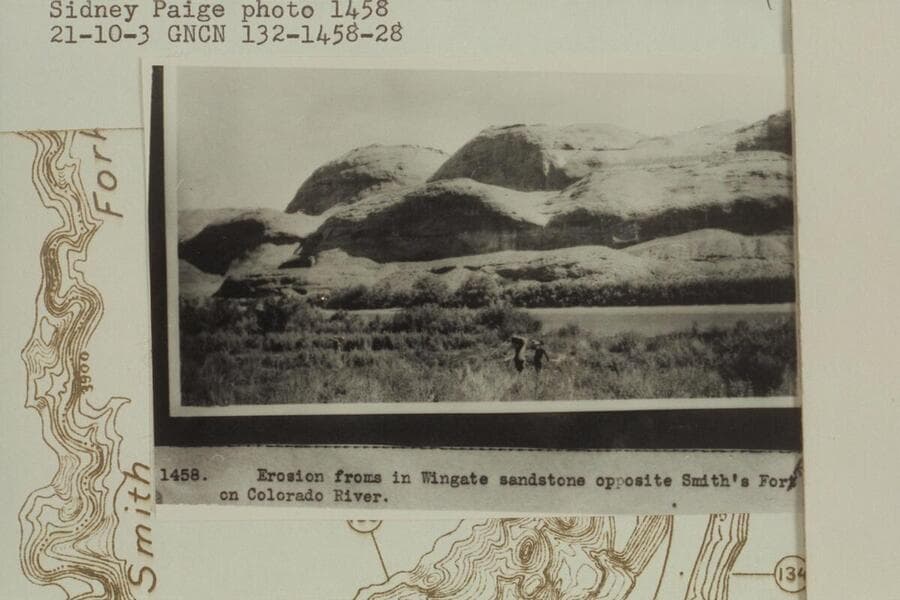 "Erosion forms in Wingate sandstone opposite Smith's Fork on Colorado River."