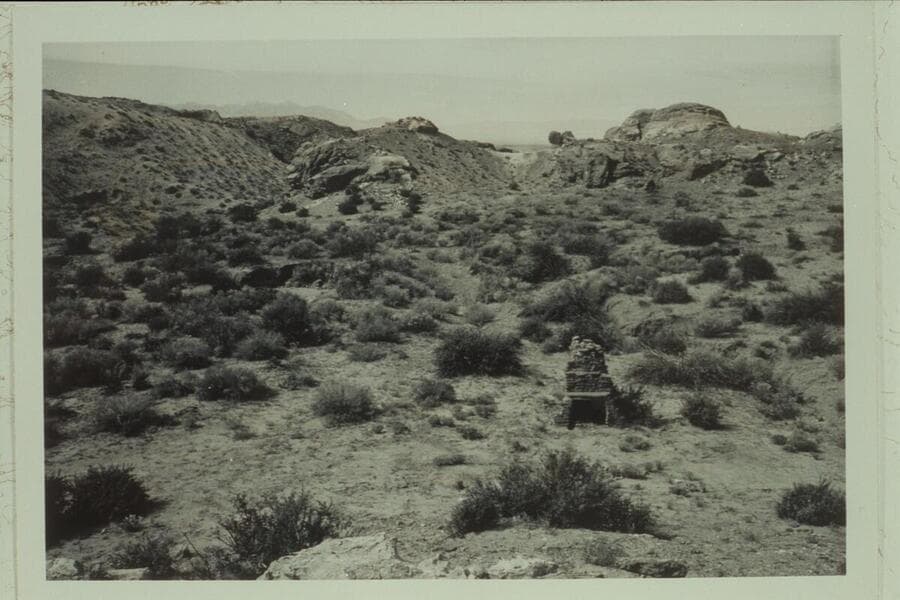 Chimney of old cabin near the name Frency cut on wall of upper end of Robbers Roost Canyon