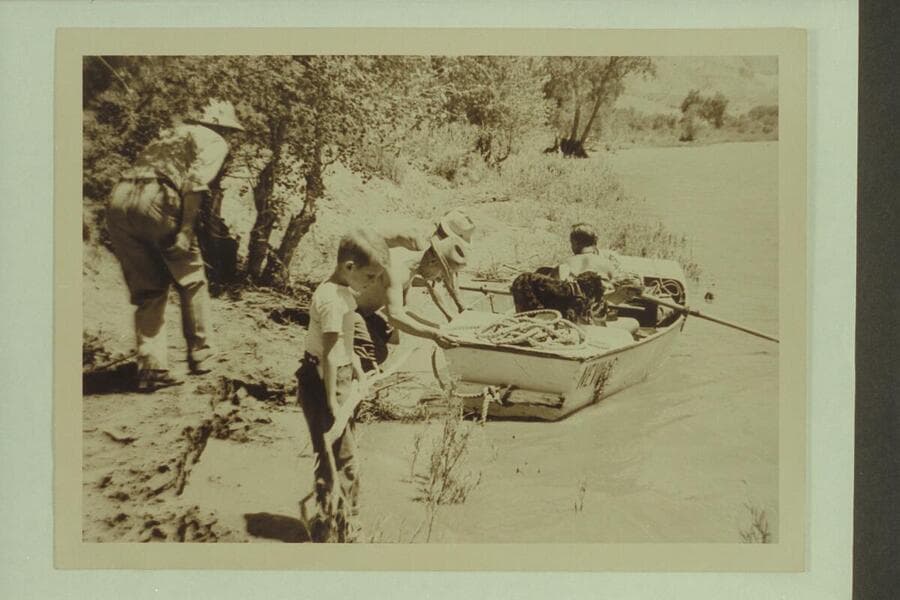Preparing to leave town of Gateway, Colorado, during traverse of Dolores River. Pres Walker is in the punt and Marston holds it from the shore