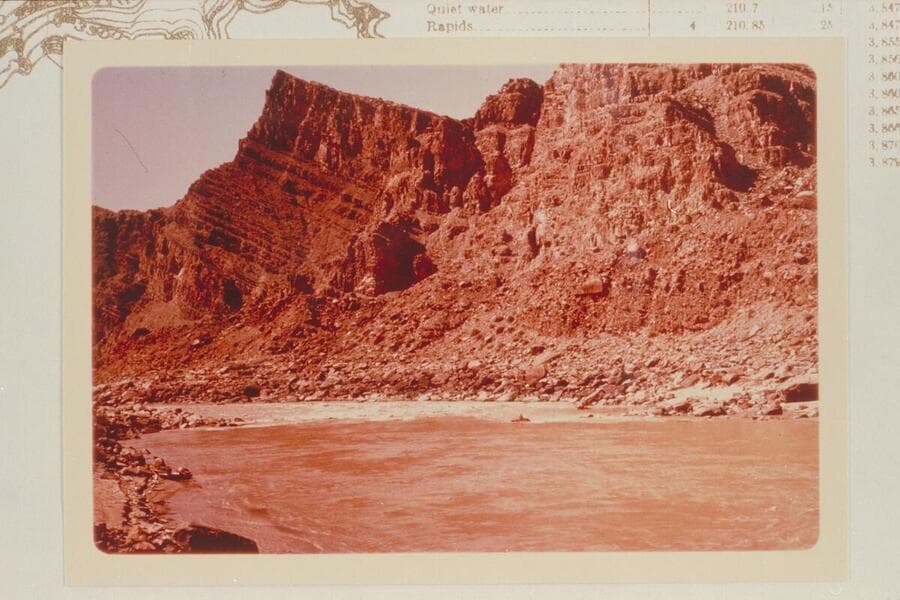 Down from camp at the head of Rapid #7, Mile 209.6. Buzz Belknap is at left, Jorgen Visbak and Bill Belknap
