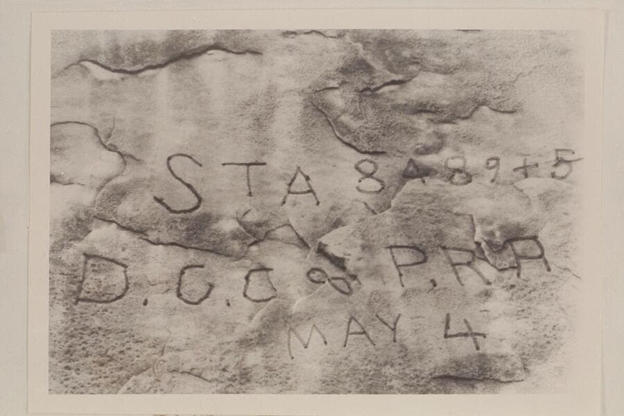 Inscription on large boulder at right bank of Colorado RiVer below mouth of Green RiVer and marking the start of the Stanton part of the rail surVey for the D.C.C. & P.R.R