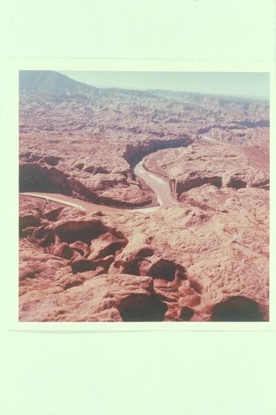 Down Glen Canyon from over Cottonwood Creek. Hidden Passage enters from right. Music Temple is at left. Anasazi Canyon enters from left above center