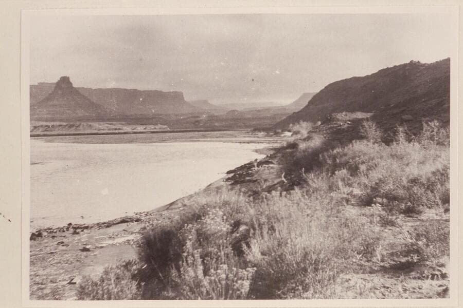 Castle Butte, left bank, mile 151, Glen Canyon. "Glen Canon. Upper rock, except one butte, eroded and gone several miles back from the river."