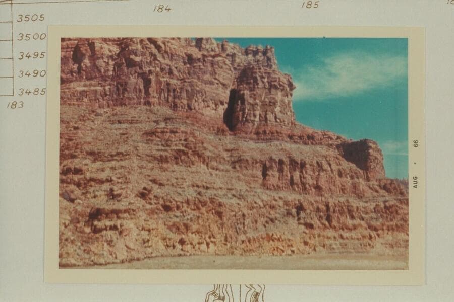 Fern Davis rock with Bill Davis standing by it. Lower end of the fan at Mile 184