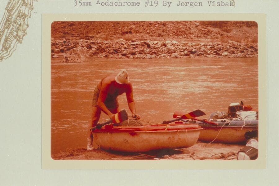 Bill Belknap finishing the packing of the Sportyak. Camp at Mile 204.9 opposite the mouth of Range Canyon