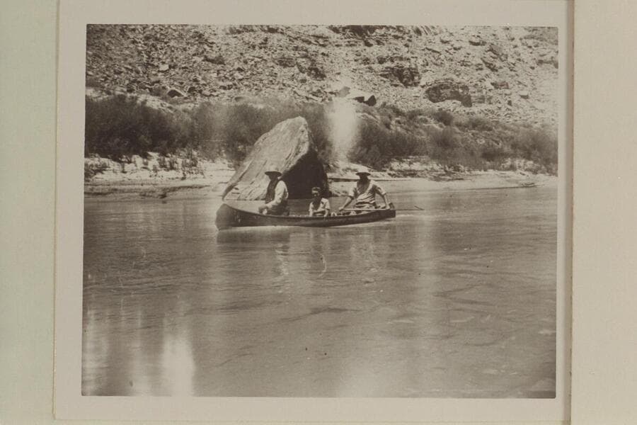 Bishop W. R. McConkie and Wayne McConkie in their canoe below the Junction in Cataract Canyon. Doris Nevills is riding as passenger