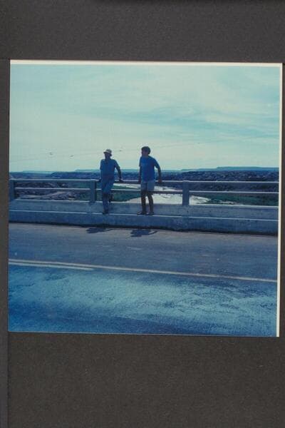 Nate and Jim Jordan at the rail of the new highway bridge at Cameron. The Little Colorado is running mud
