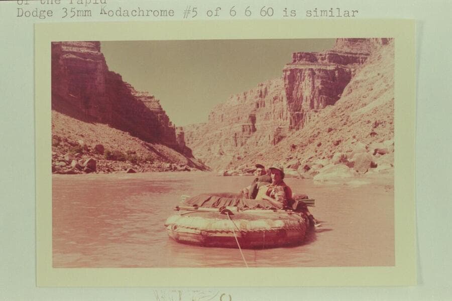 Fern and Bill Davis in the 7-man inflated boat in which they have traveled from Green River, Wyoming, to Bright Angel Creek. At Paria Riffle