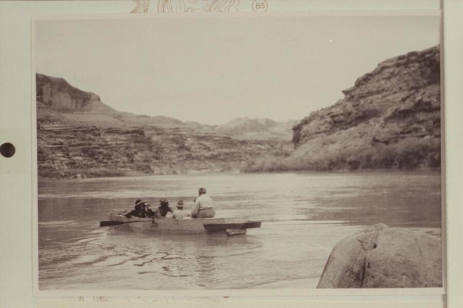 Pilgrimage to a Shrine--Hole-in-the-Rock. The horse pilgrims from Bluff cross the river to Hole-in-the-Rock after riding out over old trail from Bluff. Up river to Jackass Bench at left