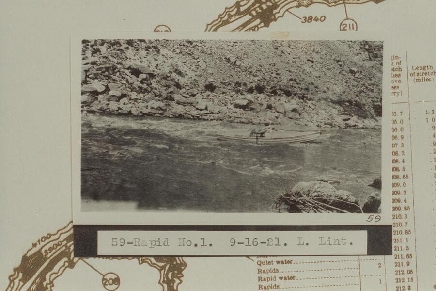 Ellsworth Kolb in USGS skiff in the Brown Betty Rapid, No. 1. The Brown Betty Rapid heads at Mile 212.3 and drops 4 ft. in .15 miles