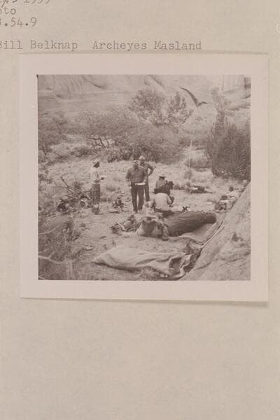 Camp in the middle fork of 73.6. Dan Lehi; Bill Belknap; Tom Daly; Buster Ordiway; Dock Marston; Archeyes Masland; Noel Morss; Tobe Owl (Nasja Begay)