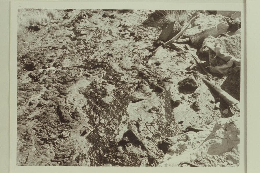 Oil seep at Bennett's old camp. Free oil running from crevice below pipe