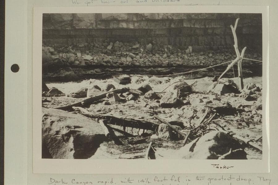 USGS boat on rocks in Dark Canyon Rapid. Lint is on shore and Emery and Ellsworth on the boat. LaRue Colorado River album #173