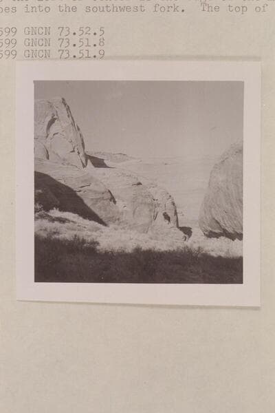 Down the middle fork of 73 from a short distance below camp. The stream undercuts the tight wall. Above and to left of center is edge of mesa over which trail goes into southwest fork