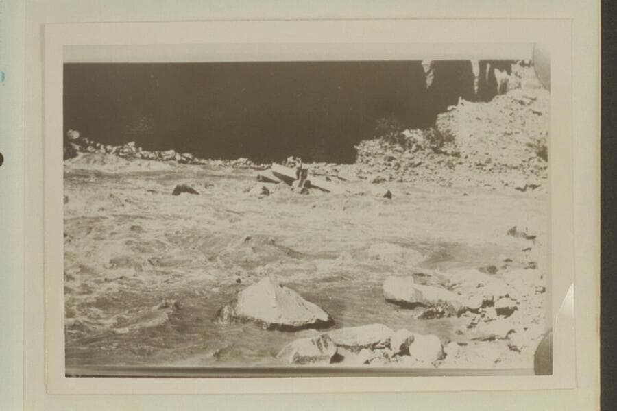 Salvage of rock-locked boat in Dark Canyon Rapid. USGS Cataract Canyon survey under W. R. Chenoweth. Copy of small print owned by Chenoweth. LaRue album No. 177. Print in Tasker album