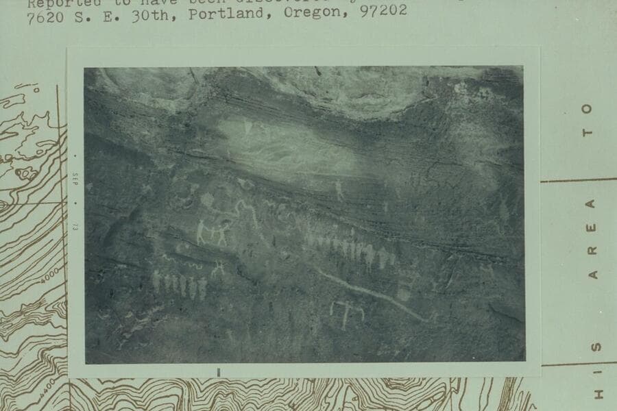 Inscriptions on boulder at Mile 212 1/2 left bank about 1/4 mile from the edge of the river and 600 ft. above the river level