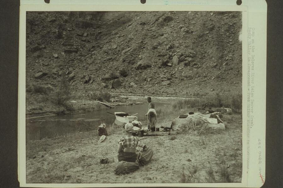 Camp, Dolores River. Margaret Marston at booking nearest the camera. Pres and Becky Walker in background. [on photo reverse: "near Beaver Creek"]