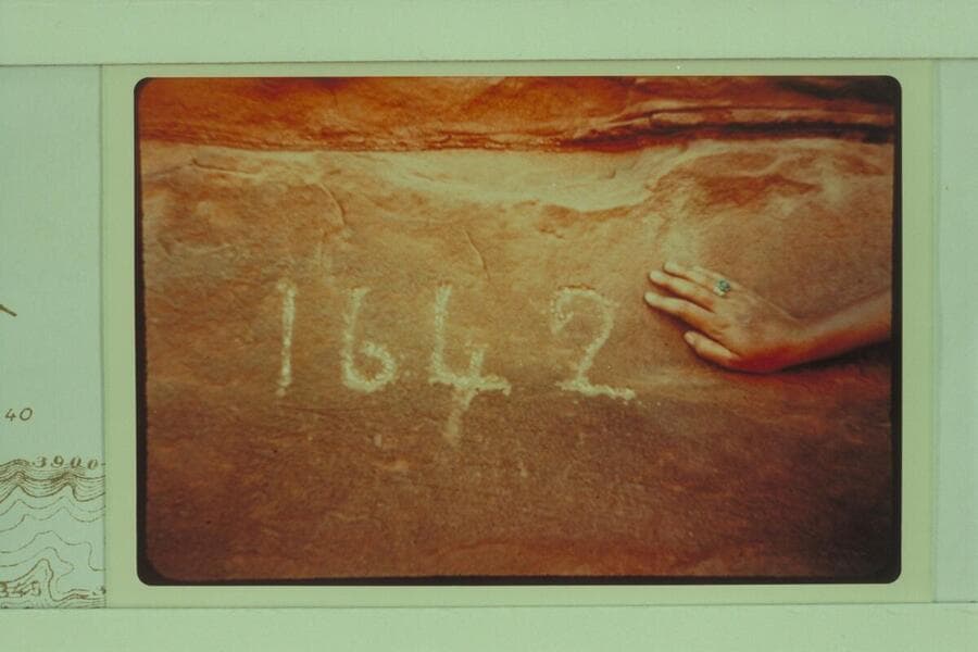 "1642" inscription opposite the mouth of Lake Canyon, Mile 113. Charles Kelly was fairly certain this inscription was a fake
