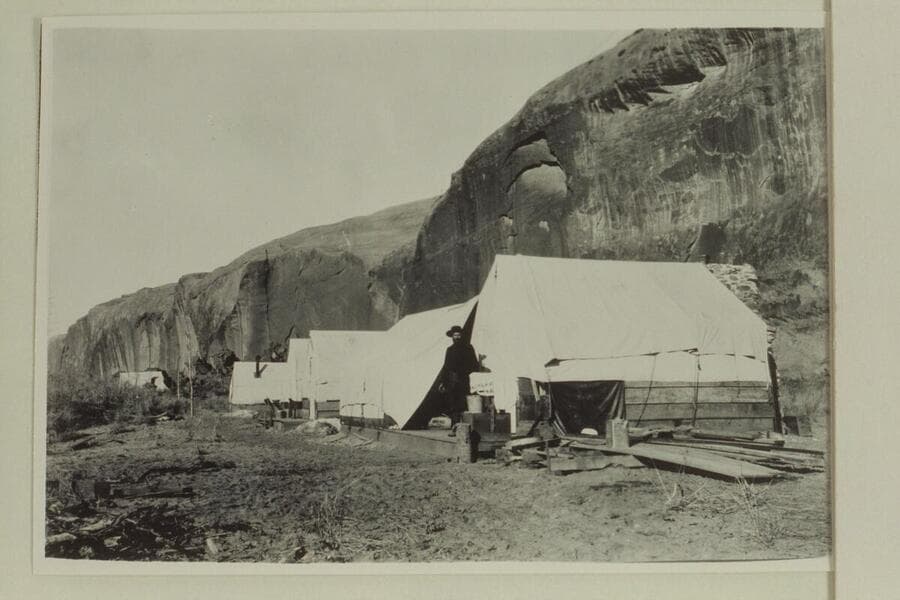 Tent house being moved on scow at Camp Stone. Glen Canyon during construction of dredge