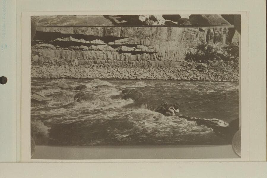 Emery Kolb "cooning" out to the trapped boat at Dark Canyon. USGS party under Chenoweth. Tasker is at left and Lint is center. Photo from Lint album