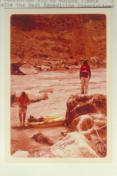 Dock Marston photographs Jorgen Visbak at the Best Expedition inscription at Rapid 16 in Cataract Canyon. Best Wreck Rapid