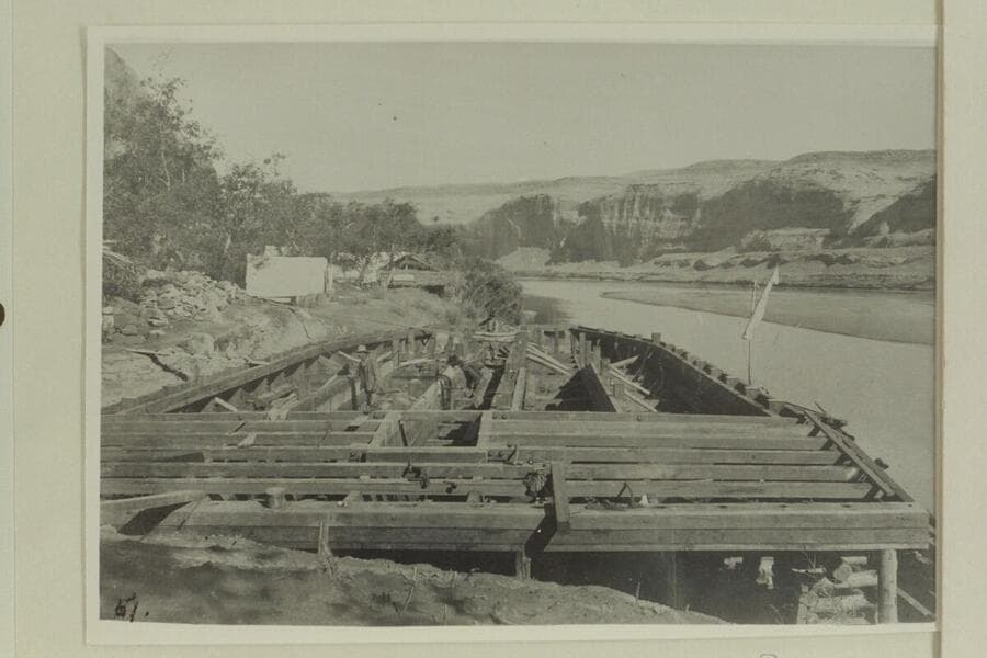 Hull of Hoskanini dredge. Under construction at Mile 121 in Glen Canyon