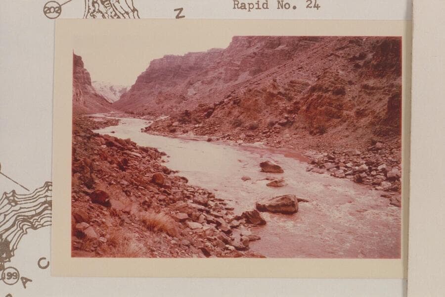 Up river to the large boulders at the head of Rapid No. 22. At the low water shown the rapid is in two sections. Visbak capsized his Sportyak at the large boulder near the right bank