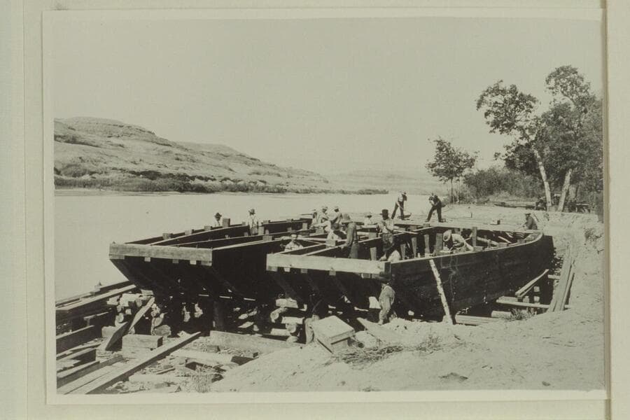 Hull of Hoskanini dredge. Under construction at Mile 121 in Glen Canyon