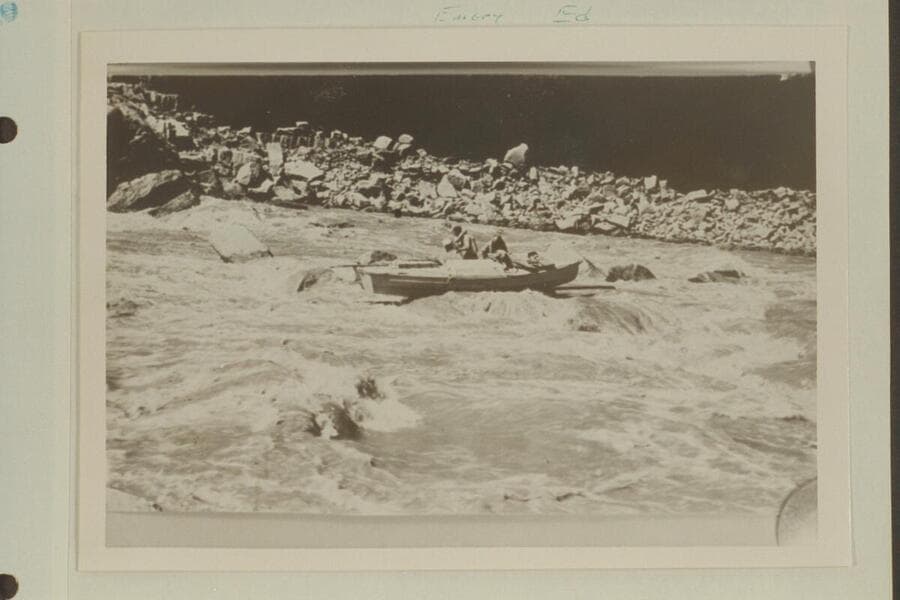 The Kolb brothers at salvage operations in the boat rock-locked in Dark Canyon Rapids. USGS Cataract Canyon survey under W. R. Chenoweth. Copy of small print loaned by Chenoweth