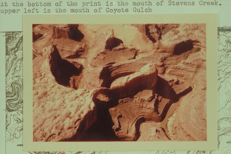 Stevens Canyon (Skyline) Arch. At the bottom of the print is the mouth of Stevens Creek. At upper left is the mouth of Coyote Gulch