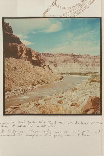 Upstream view of Colorado River in Cataract Canyon from approximately Mile 212.2. First rapid shows at left. Greenery in middle distance is at mouth of side canyon which enters river at Mile 213 opposite Spanish Bottom