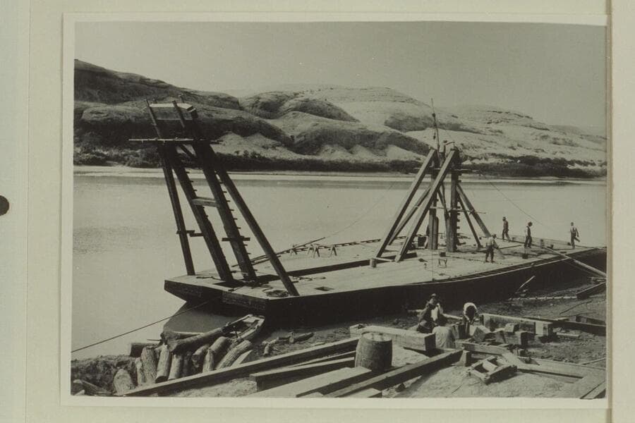 Hull of Hoskanini dredge. Under construction at Mile 121 in Glen Canyon
