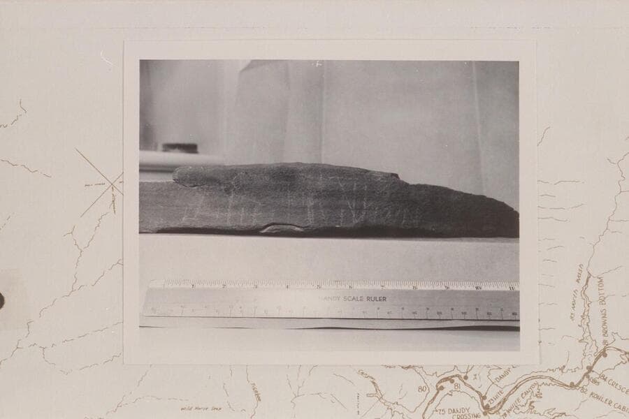 "Julie Julian" inscription on rock slab found at the Fort at Hite by Mrs. Bob Dechert in 1967