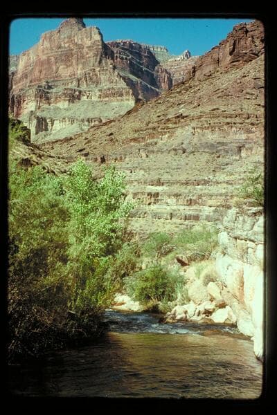 Blake and cactus. Tapeats Creek in background, just above box canyon of Tapeats Creek and not far from the river