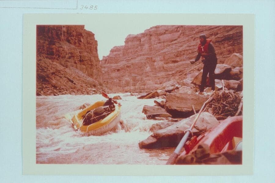 Dock Marston lines a boat at Dark Canyon Rapid. Jorgen Visbak and Buzz Belknap in distance