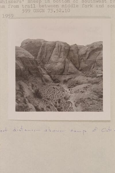 Trails of Sid Whiskers' sheep in bottom of southwest fork of 73. Looking upstream from trail between middle fork and southwest fork. Short distance above camp of 1960, Oct. 04-05
