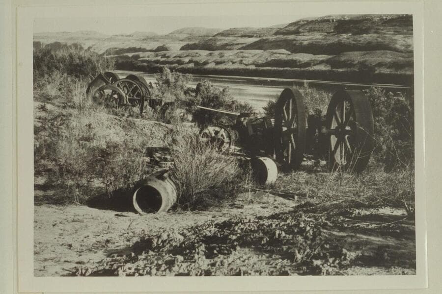Portion of Stanton Dredge exposed above low water and silt bar. Mouth of "Wilson Creek"