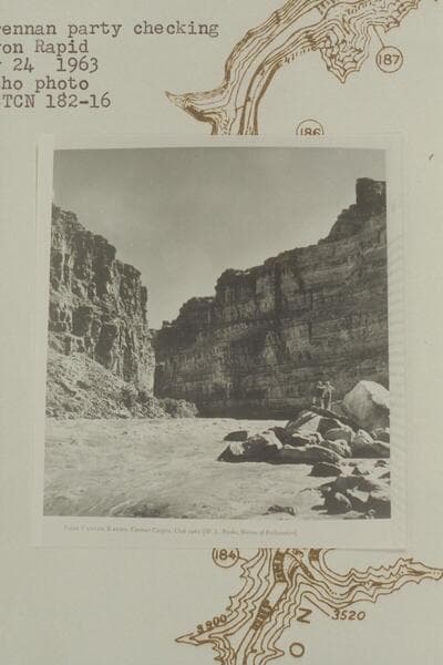 Don Harris points out course in Dark Canyon Rapid to Jack Brennan