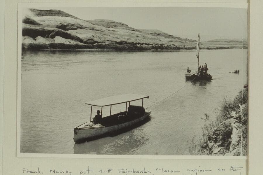 Launch of the Hoskanini Mining Company hauling the construction scow up to dredge site in Glen Canyon