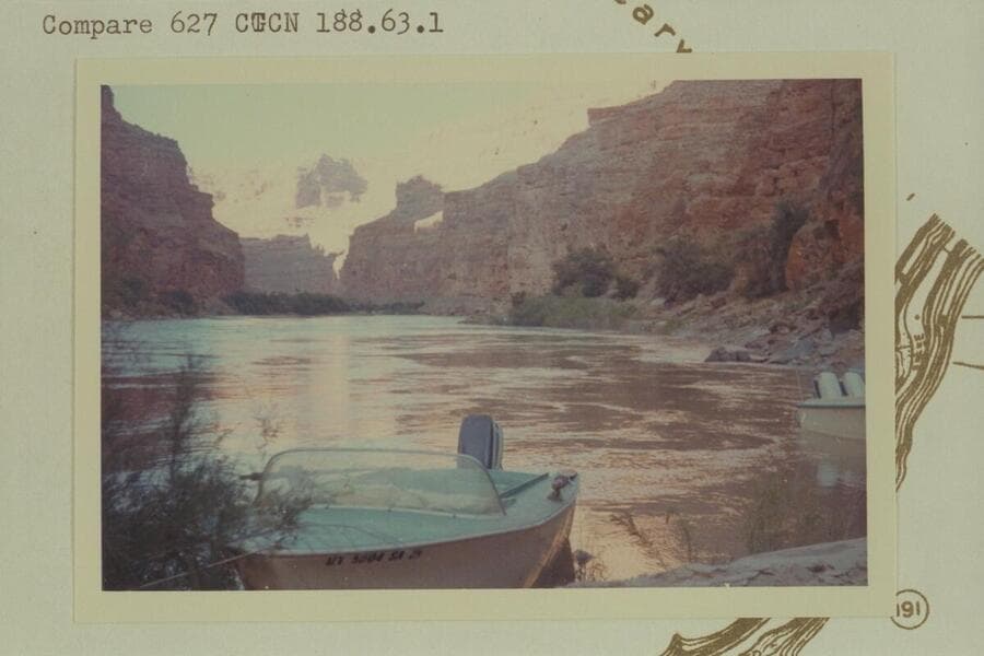 Harris-Brennan boat opposite mouth of Cove Canyon from about Mile 186 1/2