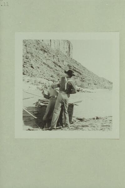 Disney filming of "The Colorado River Story." John Beal as Major Powell. Jim Drury as Walter Powell. Colorado River above Moab