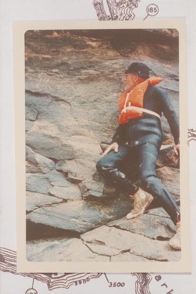 Dock Marston and Bill Belknap photographing the 1836 D. Julien inscription at Mile 185.75 left bank, Cataract Canyon