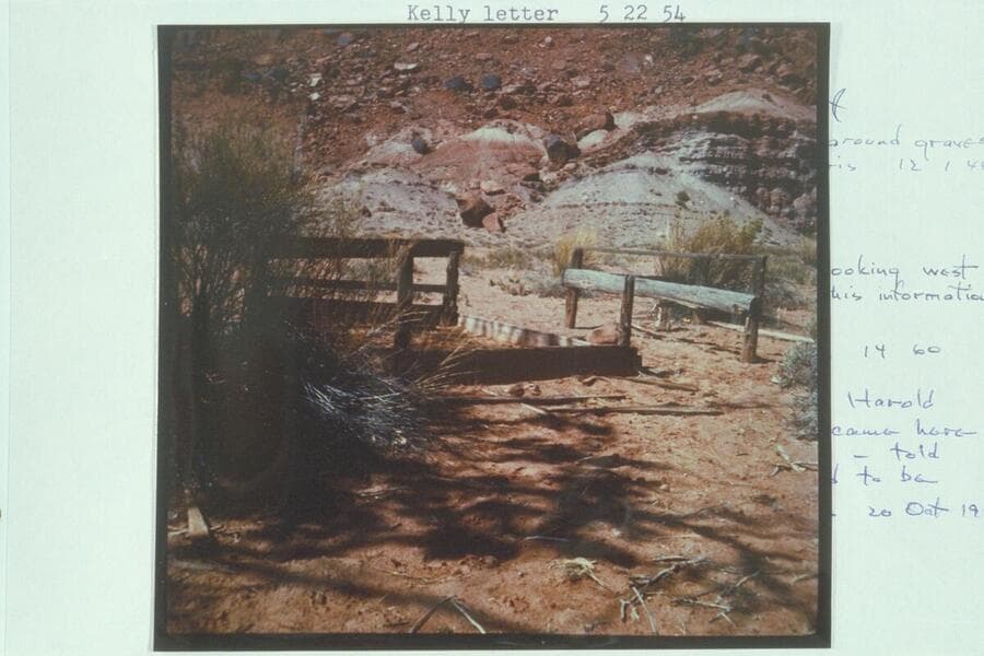 Charles Kelly at Cass Hite's grave, Tickaboo. Cass Hite died in 1914