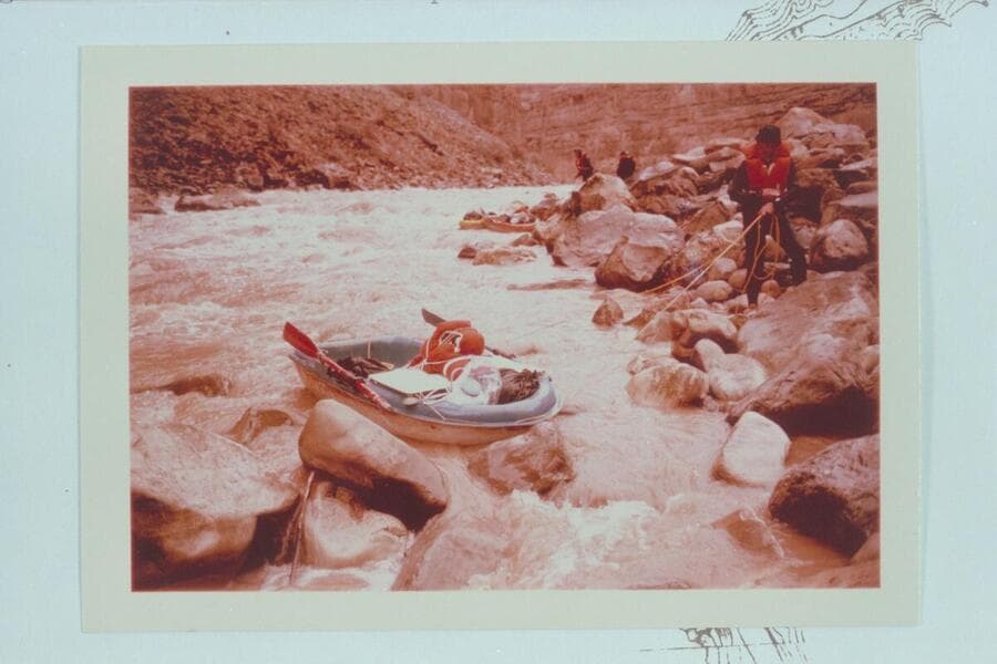 Dock Marston lining a Sportyak thru Dark Canyon Rapid. Jorgen Visbak and Buzz Belknap in distance