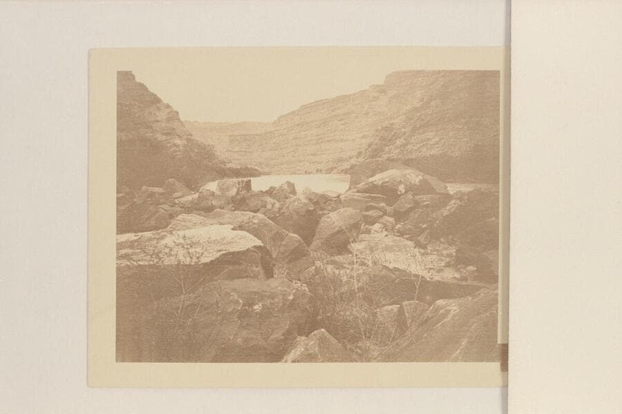 The motorboat "City of Moab" tied to the bank of the Grand River above the Junction after failing to make passage up the rapid at the Slide