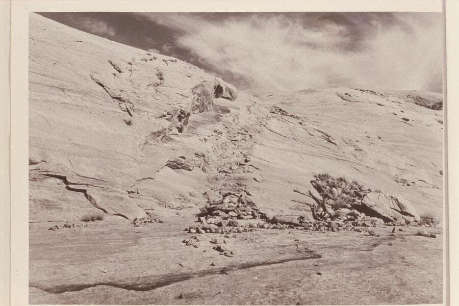 Inscription on huge rock in high cave west of Schock Trail, near Mile 111, north bank. The Schock Trail was built by Dr. Schock